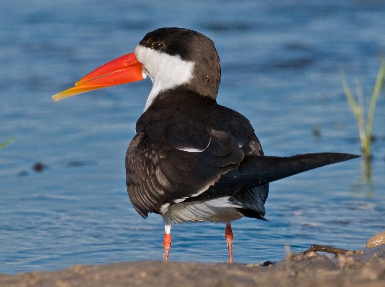 African skimmers have long wings, with a black back, hindneck, and crown. The forehead and rest of the body is white, with a bright, long, orange beak that ends with a yellow tip (black tip when immature), hence the specific name flavirostris, "yellow-beak". Their short forked tail is white, and their legs are bright red. The average size is about 38 cm (15 in) long. Their voice is a sharp "kip-kip". Their bill structure is unique; the lower mandible is much longer than the upper mandible, and is flattened sideways like scissor blades.