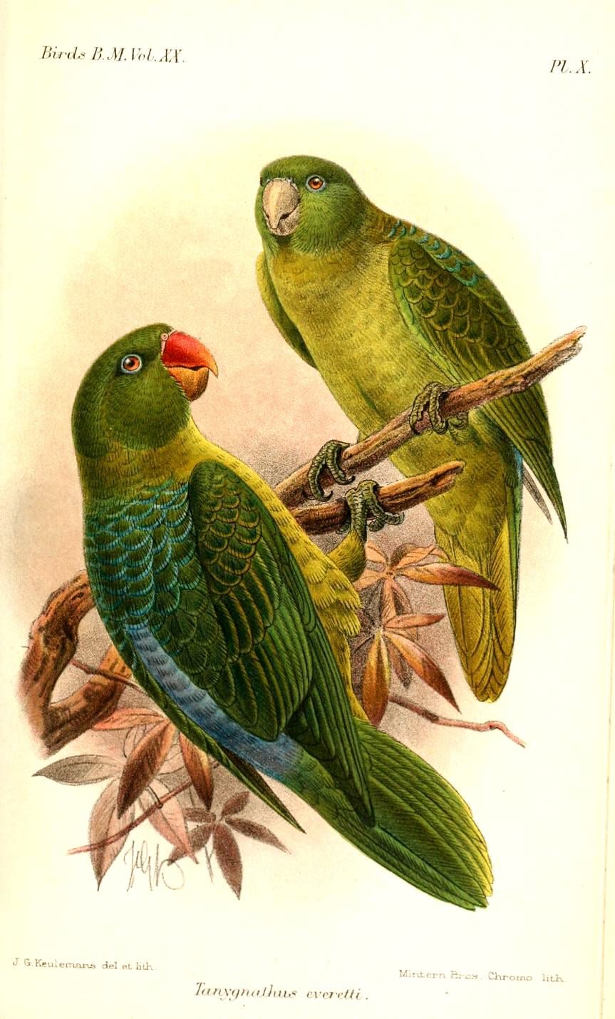The blue-backed parrot (Tanygnathus everetti), also known as Müller's (or Mueller's) parrot and Burbridge's parrot (for the Sulu subspecies) is a large, endangered species of parrot endemic to the Philippines. It is found in tropical moist lowland forest but is now feared locally extinct in a large part of its range including Negros, Panay, Leyte, Luzon and Polilio. The only recent records are in Samar, Mindanao and Tawi-tawi with the population being estimated below 250 individuals. Flocks are small and often active at night. Its main threats are habitat loss and trapping for the pet trade.