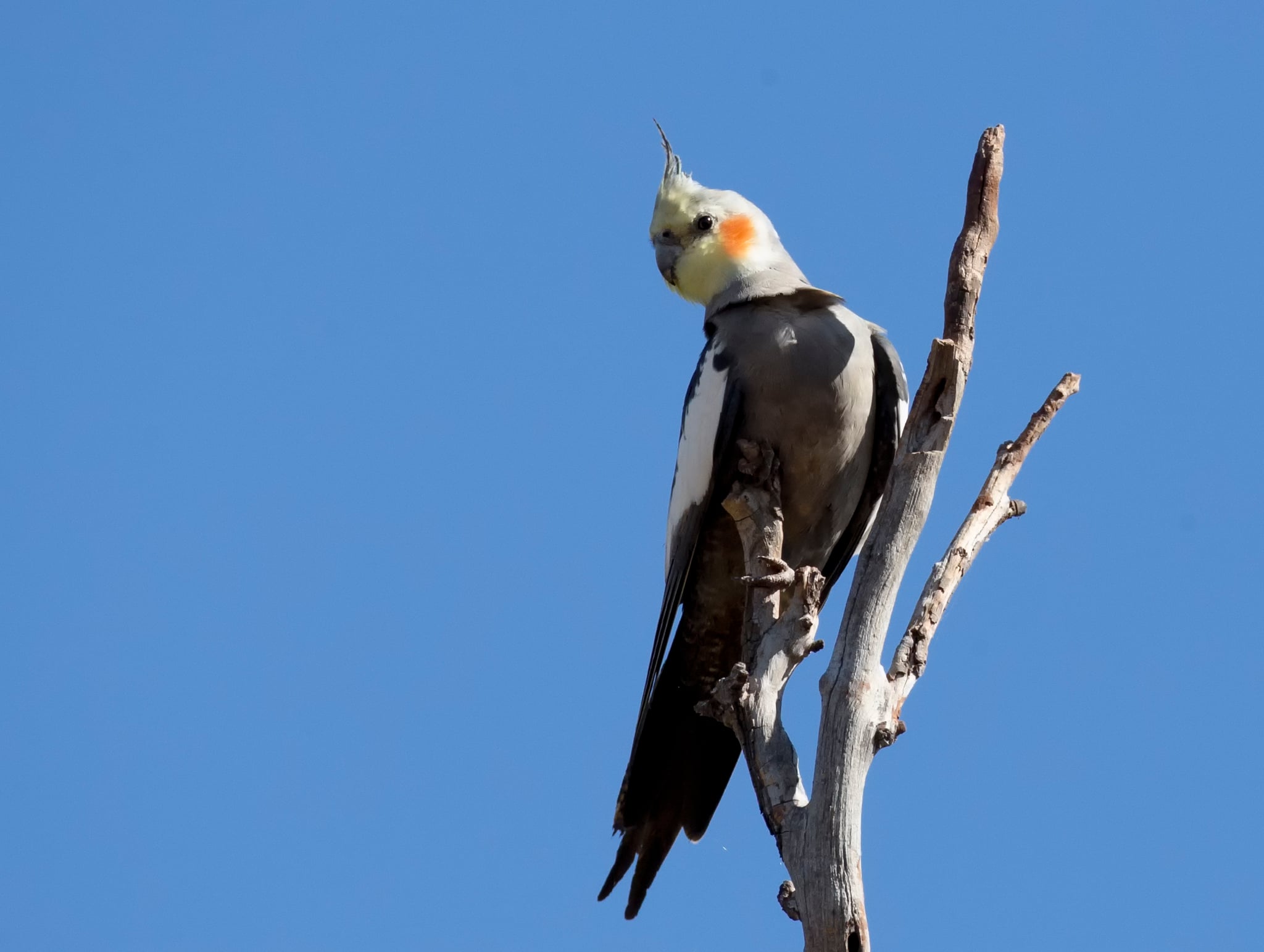 The "normal grey" or "wild-type" cockatiel's plumage is primarily grey with prominent white flashes on the outer edges of each wing. The face of the male is yellow or white, while the face of the female is primarily grey or light grey, and both sexes feature a round orange area on both ears, often referred to as "cheddar cheeks". This orange colouration is generally vibrant in adult males, and often quite muted in females. Visual sexing is often possible with this variant of the bird.