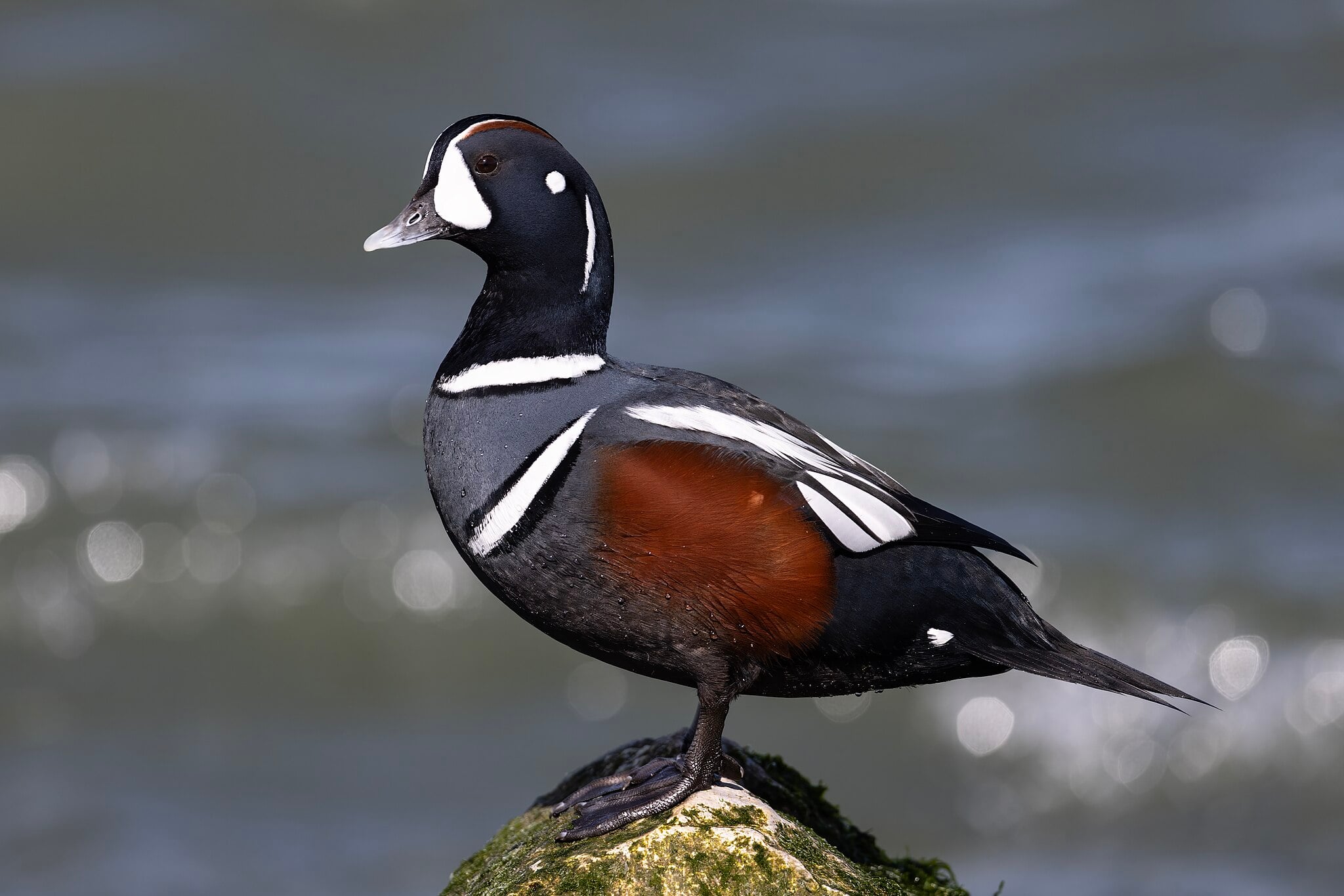 The harlequin duck (Histrionicus histrionicus) is a small sea duck. It takes its name from Harlequin (Italian Arlecchino, French Arlequin), a colourfully dressed character in Commedia dell'arte. The species name comes from the Latin word "histrio", meaning "actor". Other names include painted duck, totem pole duck, rock duck, glacier duck, mountain duck, white-eyed diver, squeaker, lords and ladies and blue streak.