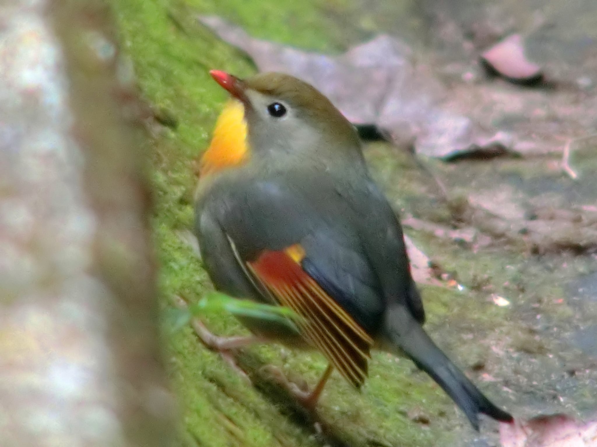 The red-billed leiothrix (Leiothrix lutea) is a member of the family Leiothrichidae, native to southern China and the Himalayas. Adults have bright red bills and a dull yellow ring around their eyes. Their backs are dull olive green, and they have a bright yellow-orange throat with a yellow chin; females are somewhat duller than males, and juveniles have black bills. It has also been introduced in various parts of the world, with small populations of escapees having existed in Japan since the 1980s. It has become a common cagebird and amongst aviculturists it goes by various names: Pekin robin, Pekin nightingale, Japanese nightingale, and Japanese (hill) robin, the last two being misnomers as it is not native to Japan (although it has been introduced and naturalised there).
