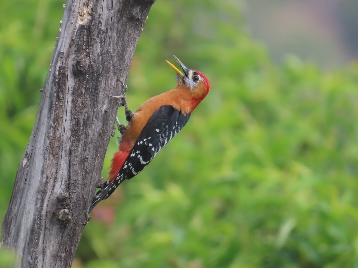 The rufous-bellied woodpecker ranges in length from about 19 to 23 cm (7.5 to 9.1 in). The male has a red crown while the female has a black crown, speckled with white. Both sexes have a black mantle and back, while the wings are black barred with white. The upper tail is black, with some white barring on the outer two pairs of feathers. The face is white and the throat and underparts are a uniform cinnamon or rufous. The lower belly is black barred with white and the under-tail converts are red or pink. The iris is chestnut, the upper mandible of the beak is black and the lower mandible grey, and the legs are grey or olive.