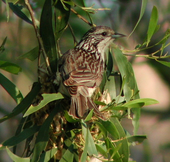 The striped honeyeater (Plectorhyncha lanceolata) is a passerine bird of the honeyeater family, Meliphagidae, found in Australia. It is a medium-sized honeyeater, about 23 cm (9.1 in) in length. Both sexes are a light greyish brown with dark brown centres to the feathers, which give the appearance of stripes. The stripes are particularly distinct on the head and back of the neck. While it is found mainly in inland eastern Australia where it inhabits the drier open forest, it is also found in coastal swamp forest from southeast Queensland to the central coast of New South Wales.