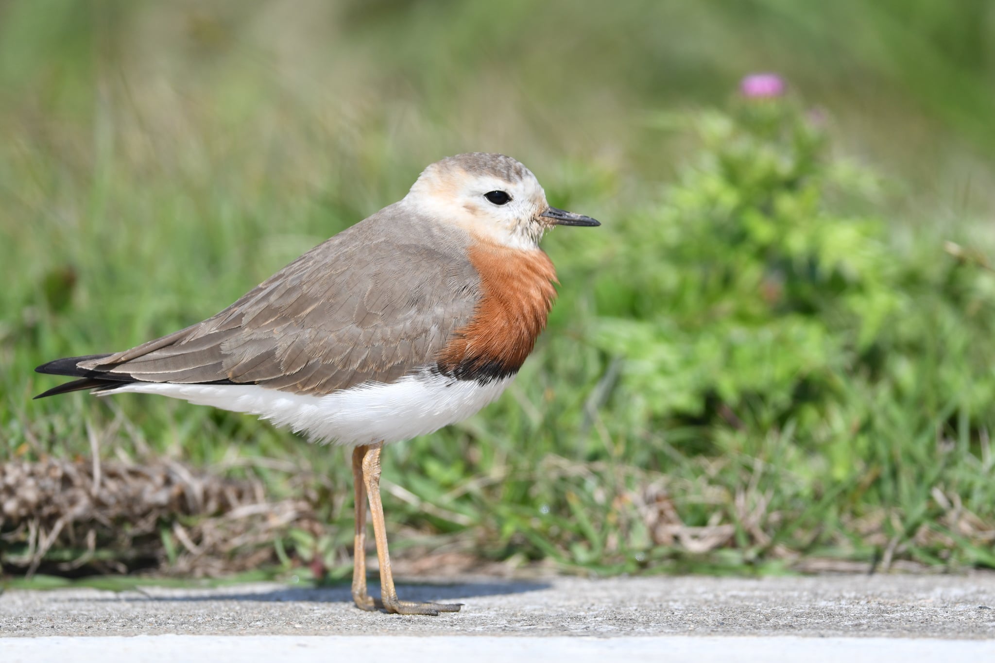 Among the red-breasted Charadrius plovers, this bird is relatively large, long-legged and long-winged.