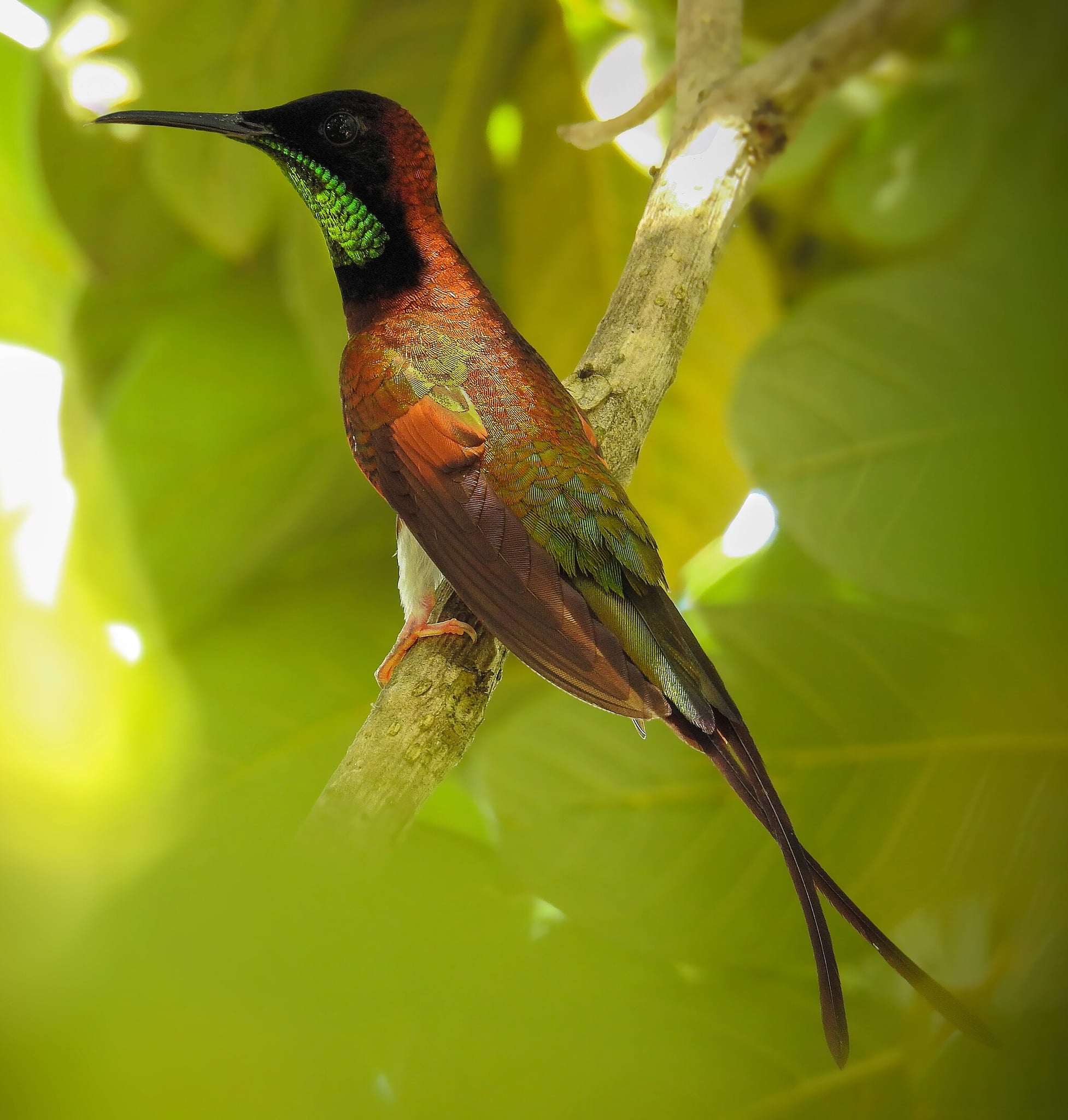 Male and female crimson topaz have different plumages. Both have a straight to slightly decurved bill. The male's head, face, and the sides of the neck are velvety black. Its back is iridescent crimson to gold on the uppertail coverts. The central tail feathers are bronzy green and the outer ones chestnut; two of the latter are elongated and crossed. The throat is golden green surrounded by a black band and the underparts bright red. The wings are brown. The female's head and back are dark green and its underparts a lighter green with golden green inclusions; the throat is green with crimson inclusions. The central tail feathers are bronzy, the middle pair violet, and the outer pair chestnut, and none are elongated like the male's.