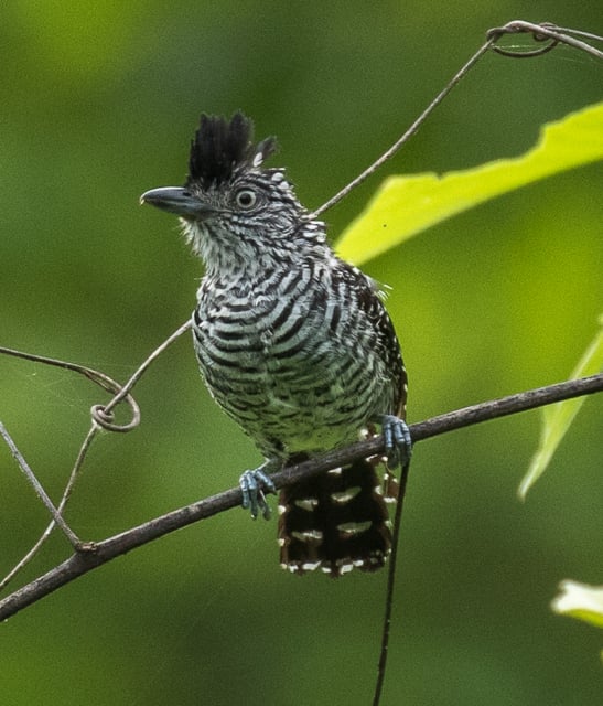 The barred antshrike is 15 to 18.5 cm (5.9 to 7.3 in) long and weighs 24 to 32 g (0.85 to 1.1 oz). Members of genus Thamnophilus are largish members of the antbird family; all have stout bills with a hook like those of true shrikes. This species exhibits marked sexual dimorphism though both sexes have a bushy crest. Adult males of the nominate subspecies T. d. doliatus are almost entirely plumaged with alternating black and white bars. The black bars on their upperparts are thicker than the white bars; on their underparts the black bars are thinner than the white ones. Their face, throat, and chin have thin black and white streaks. Their crest is black with white bases on the middle feathers. Adult females have a cinnamon-rufous crest and upperparts. The sides of their head and neck are streaked black and white or buff. Their chin is buff and their underparts ochraceous-buff. Adults of both sexes have a pale yellow iris, a black maxilla, a bluish gray mandible, and lead-gray legs and feet. Juvenile males are barred with black and light yellowish brown.