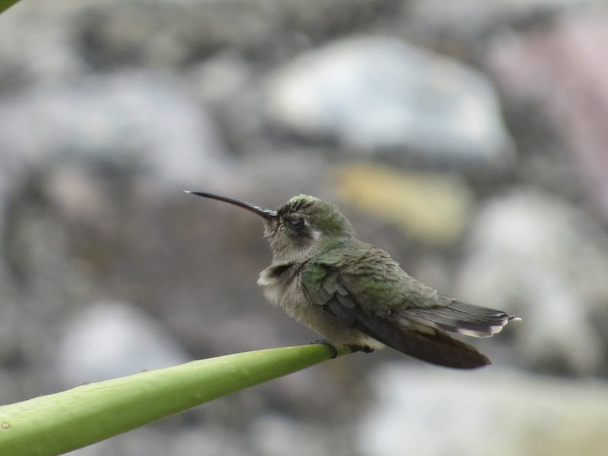 The dusky hummingbird is 9 to 10.6 cm (3.5 to 4.2 in) long. Males weigh about 4.3 g (0.15 oz) and females about 3.4 g (0.12 oz). Males have a bright red bill with a black tip. Their upperparts are bronze green to greenish bronze that is more brownish or grayish on the crown and uppertail coverts. The tail is dull greenish bronze or grayish brown with a greenish gloss and dusky feather bases. It has a grayish streak behind the eye and dusky cheeks. It does not have an iridescent gorget like most other hummingbirds, but a deep gray throat with greenish flecks. Its underparts are slightly lighter gray down to the undertail coverts, which are buffy. It has white leg tufts. The female is much like the male. However, its bill is a duller red with a dark tip, its outer tail feathers have a blackish blue band near the end and brownish-gray tips, and its underparts are a paler gray.