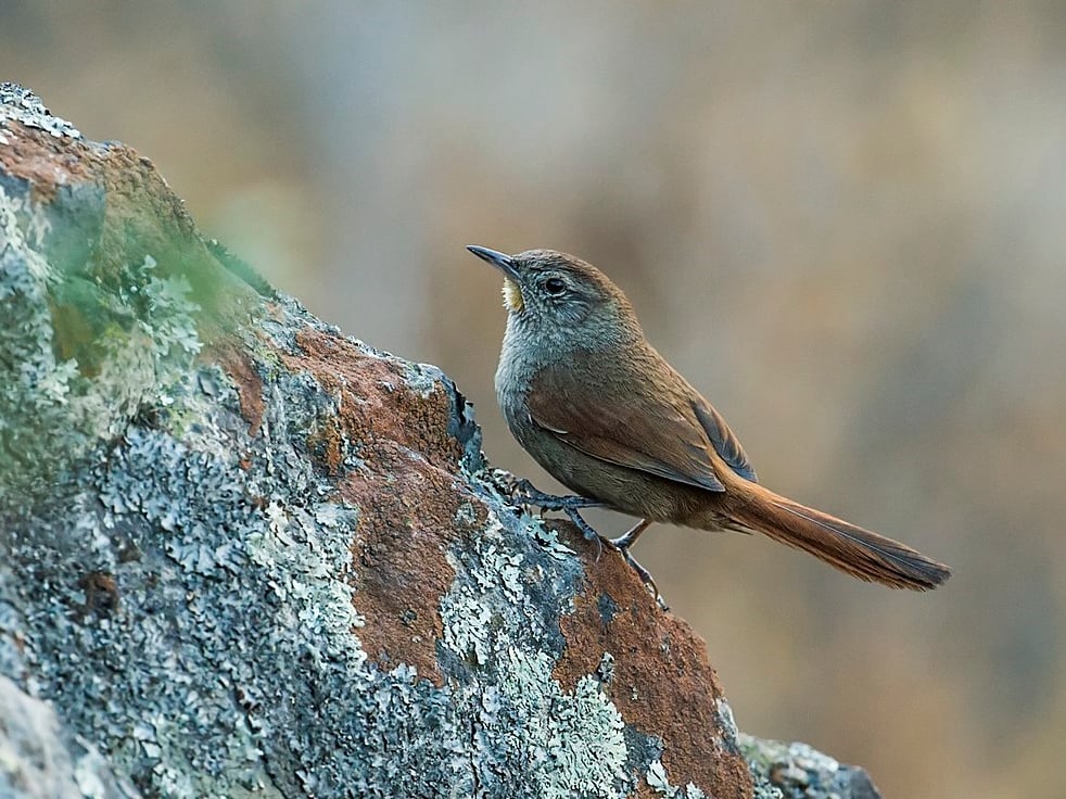 The canyon canastero is 15 to 17 cm (5.9 to 6.7 in) long and weighs 13 to 17 g (0.46 to 0.60 oz). The sexes have the same plumage. Adults of the nominate subspecies have a thin buff supercilium and dark brownish lores on an otherwise gray-brown face. Their crown is warm dark brown and their back and rump a slightly paler brown. Their wings are dull reddish brown. Their uppertail coverts are chestnut-rufous and their tail a more rufous brown than the back. Their chin and upper throat are pale tawny-orange, their lower throat and upper breast light gray-brown with faint paler streaks, their lower breast and belly unstreaked pale gray-brown, and their flanks and undertail coverts dull rufescent brown. Their iris is brown, their maxilla black to dark horn, their mandible gray to pinkish horn with a blackish tip, and their legs and feet gray to blackish. Juveniles' chin and throat are light gray-brown, their breast has faint dark bars, and their underparts have a brownish wash. Subspecies A. p. neglecta has a darker back than the nominate, a more chestnut chin and throat, and darker and browner underparts. A. p. grisior is paler than the nominate with slightly grayer underparts and slightly less rufescent flanks.
