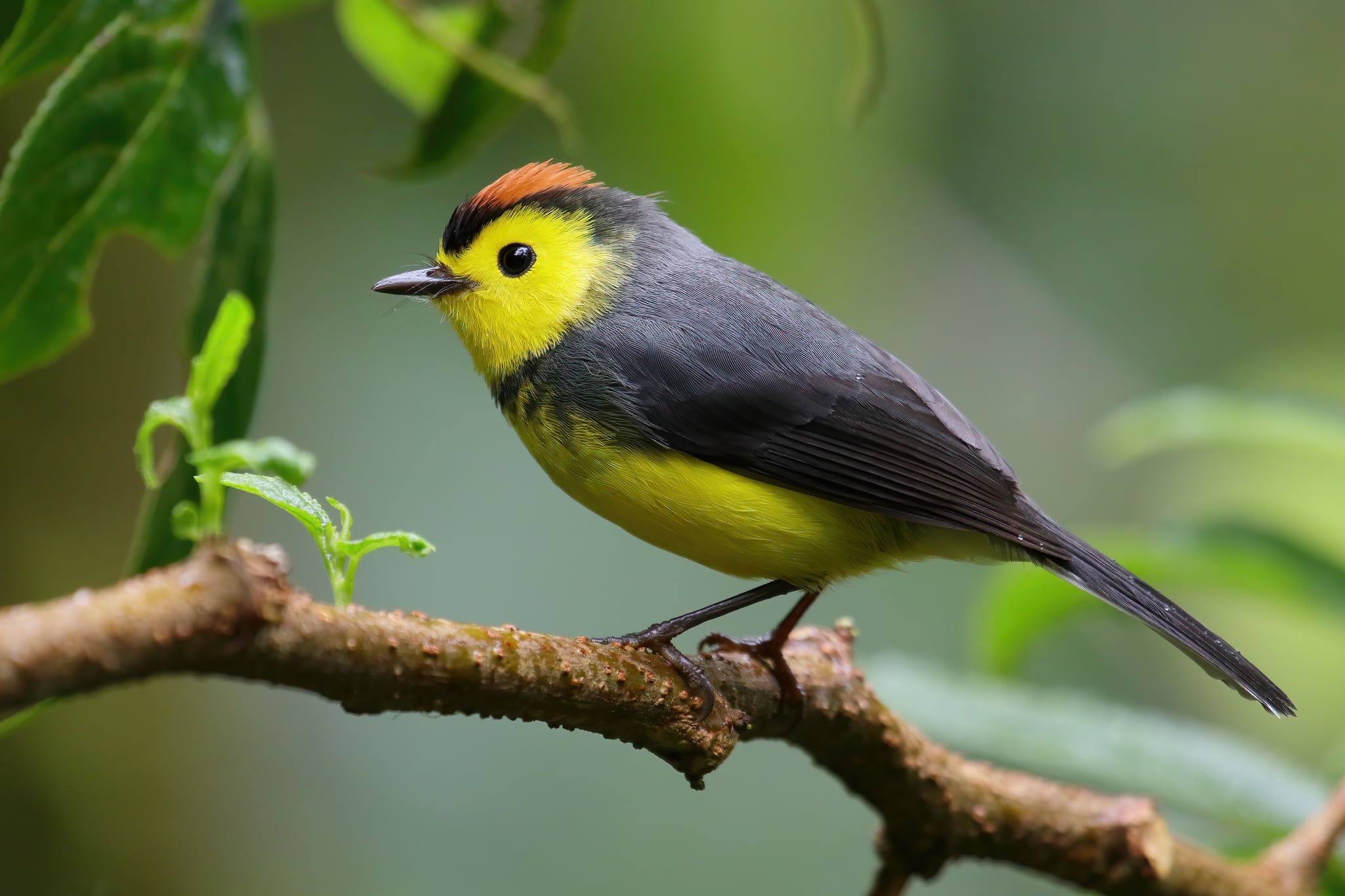 The sexes are similar, but young birds are duller, with a browner back, weakly yellow underparts, and the head entirely slate-coloured, with no yellow on the face or red on the crown.