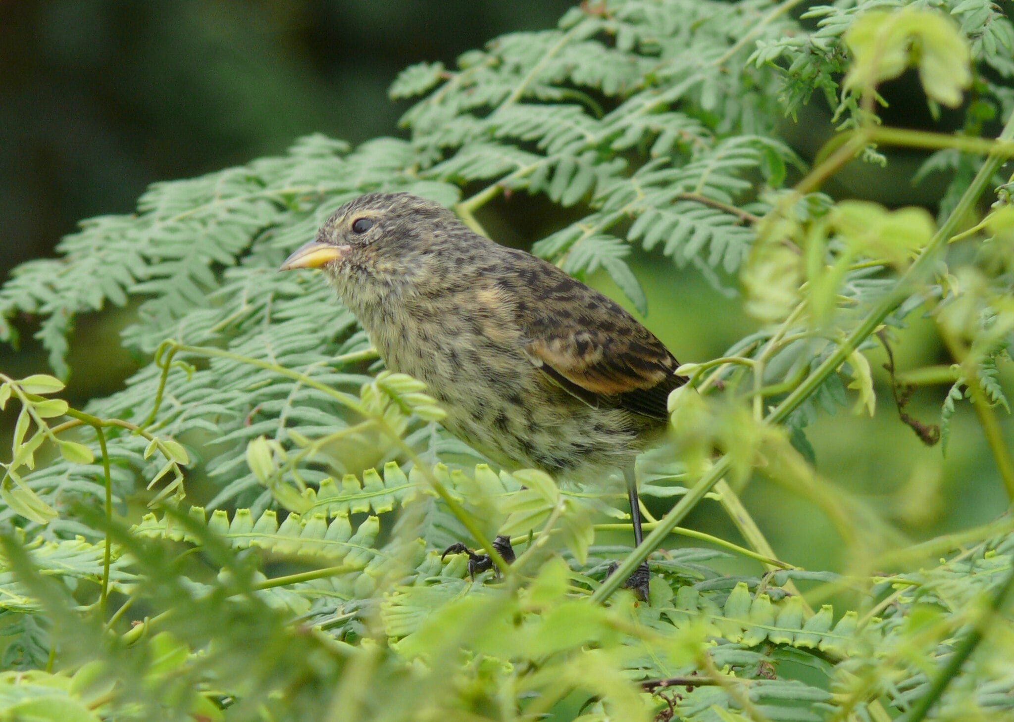 Female Cocos finches have a lighter brown complexion compared to males. There is a black splattering of feathers on their breast area down to the flank and rump. The belly of the female Cocos finch is milky white compared to the mantle of the bird. The nape and crown area are more noticeably black. The young are similar, but have yellow bills.