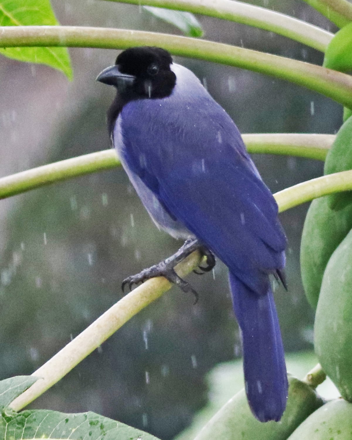 This is a medium-large jay with dull violet-blue plumage and a striking dark face and throat. The purplish jay (with which it overlaps in southeastern Peru and in northern Bolivia) is duller (more purplish or brownish blue, less violaceous blue) and the nape is not paler than the back. In eastern Colombia and southern Venezuela, the azure-naped jay is distinguished by its pale iris, white undertail coverts and tip to the tail, paler nape, and short frontal crest. The violaceous jay is 33–38 cm (13–15 in) long and weighs 262 grams (9.2 ounces).)