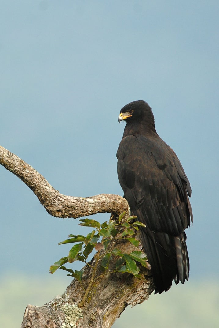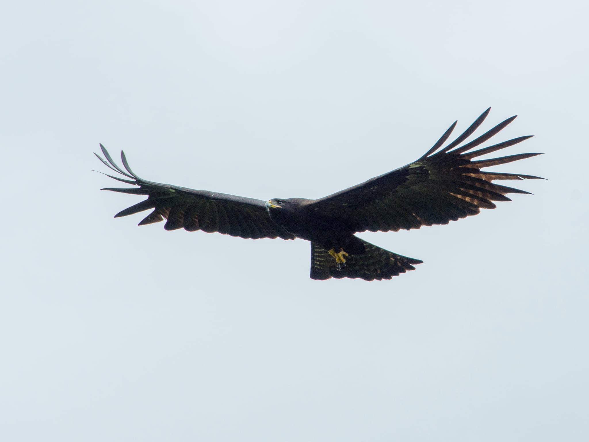 The black eagle is a large but slender eagle, at about 75 cm (30 in) in length and 148 to 182 cm (4 ft 10 in to 6 ft 0 in) in wingspan. Despite its large appearance (it is one of the largest eagles in its range), known weights are relatively modest, at between 1,000 and 1,600 g (2.2 and 3.5 lb), about half the weight of the partially sympatric mountain hawk-eagle, the latter being of a similar total length. Adults have all-black plumage, with a yellow bill base (cere) and feet. The wings are long and pinched in at the innermost primaries giving a distinctive shape. The tail shows faint barring and upper tail covers are paler. When perched the wing tips reach till or exceed the tail tip. The wings are held in a shallow V (wings just above the horizontal plane) in flight. Seen on hot afternoons, scouring the treetops for a nest to maraud, this bird is easily spotted by its jet black colour, large size, and a characteristic slow flight, sometimes just above the canopy.