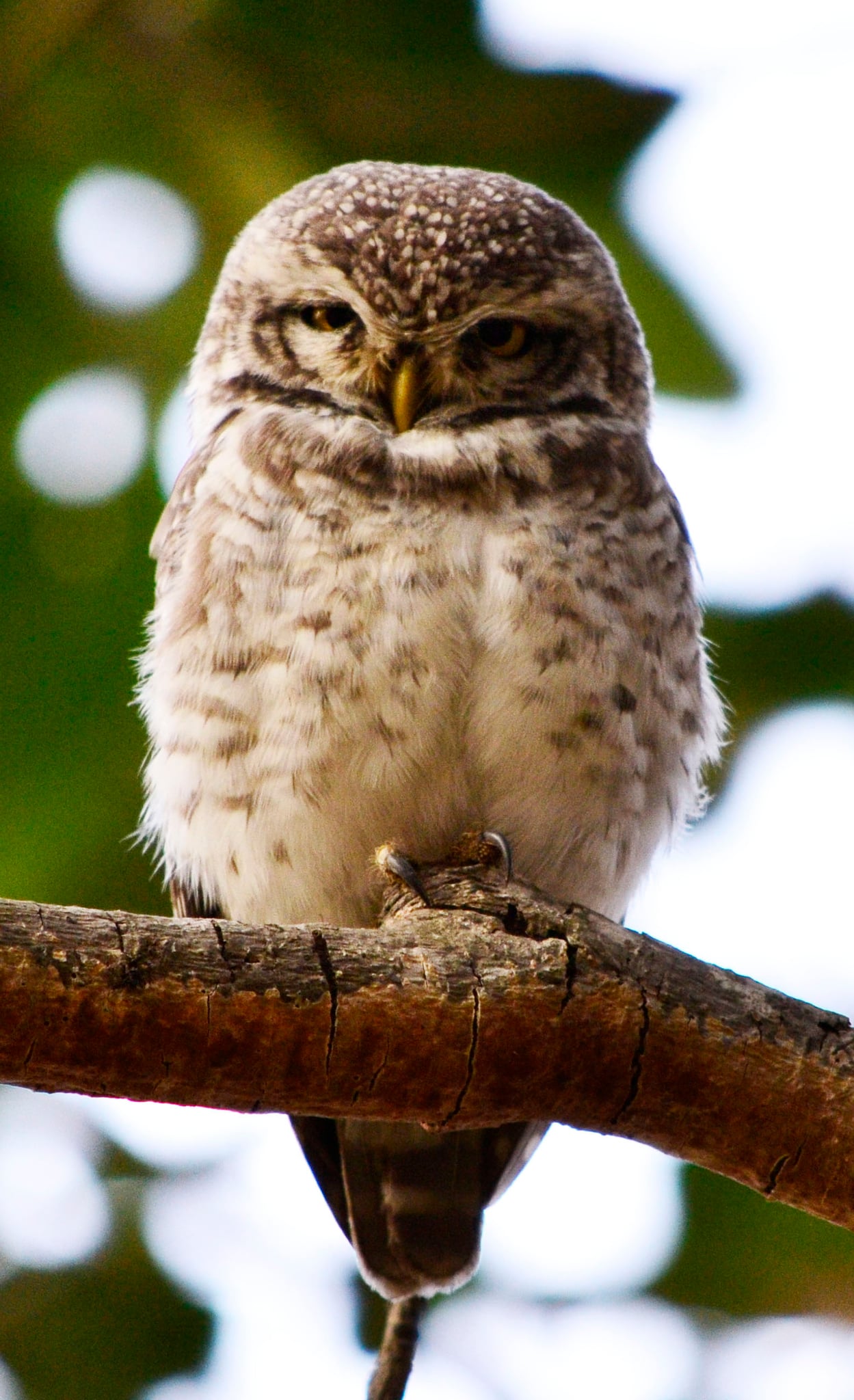 The spotted owlet is a small and stocky bird, barely 21 cm (8.3 in) in size. The upperparts are grey-brown, heavily spotted with white. The underparts are white, streaked with brown. The facial disc is pale and the iris is yellow. There is a white neckband and supercilium. Sexes are similar. The flight is deeply undulating. The nominate form is darker than the paler forms such as indica of drier regions.