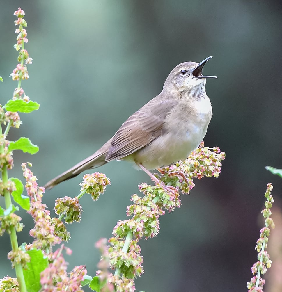 Long-billed bush warbler is small brown bird with pink legs, a relatively long black bill and brown eyes. Its body is brown with a pale breast, throat, and supercilium. Its song is a repetitive clicking noise similar to that of grasshopper but less buzzy.