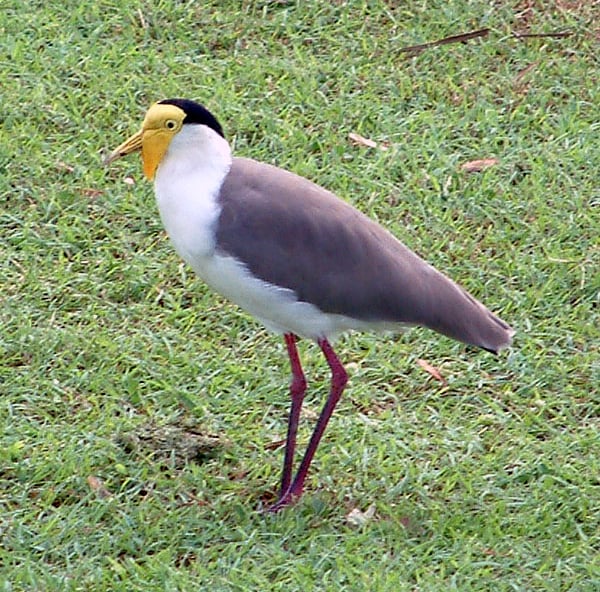 The masked lapwing (Vanellus miles) is a large, common and conspicuous bird native to Australia (particularly the northern and eastern parts of the continent), New Zealand and New Guinea. It spends most of its time on the ground searching for food such as insects and worms, and has several distinctive calls. It is common in Australian fields and open land, and is known for its defensive swooping behaviour during the nesting season.
