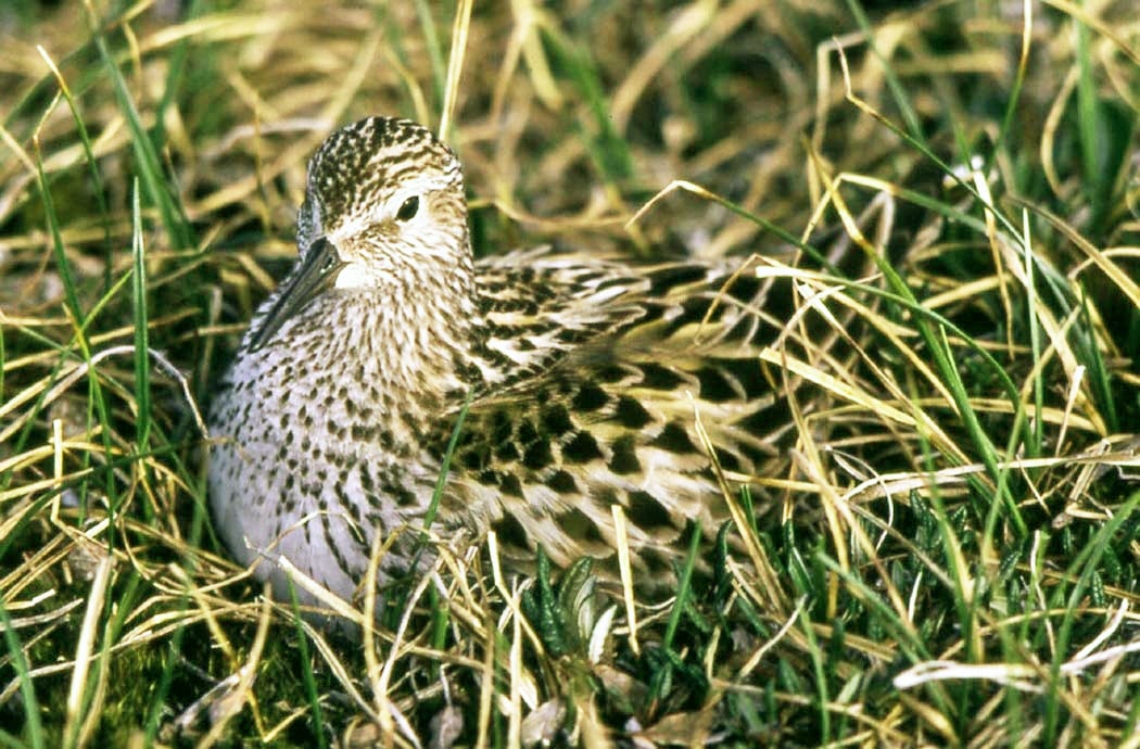 The white-rumped sandpiper (Calidris fuscicollis) is a small shorebird that breeds in the northern tundra of Canada and Alaska. This bird can be difficult to distinguish from other similar tiny shorebirds; these are known collectively as "peeps" or "stints".