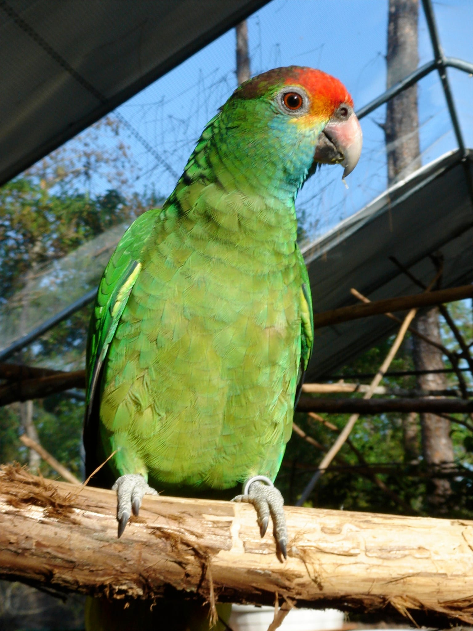 The red-browed amazon (Amazona rhodocorytha) is a species of parrot in the family Psittacidae. It is endemic to Atlantic Forest in eastern Brazil. It has been considered a subspecies of the blue-cheeked amazon (Amazona dufresniana), but today all major authorities consider them separate species. It is threatened both by habitat loss and by being captured for the trade in wild parrots.