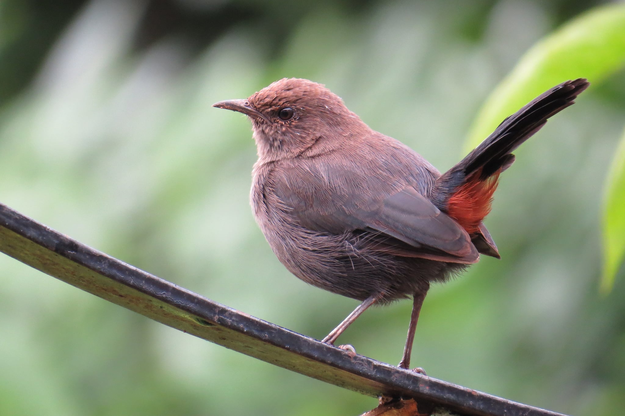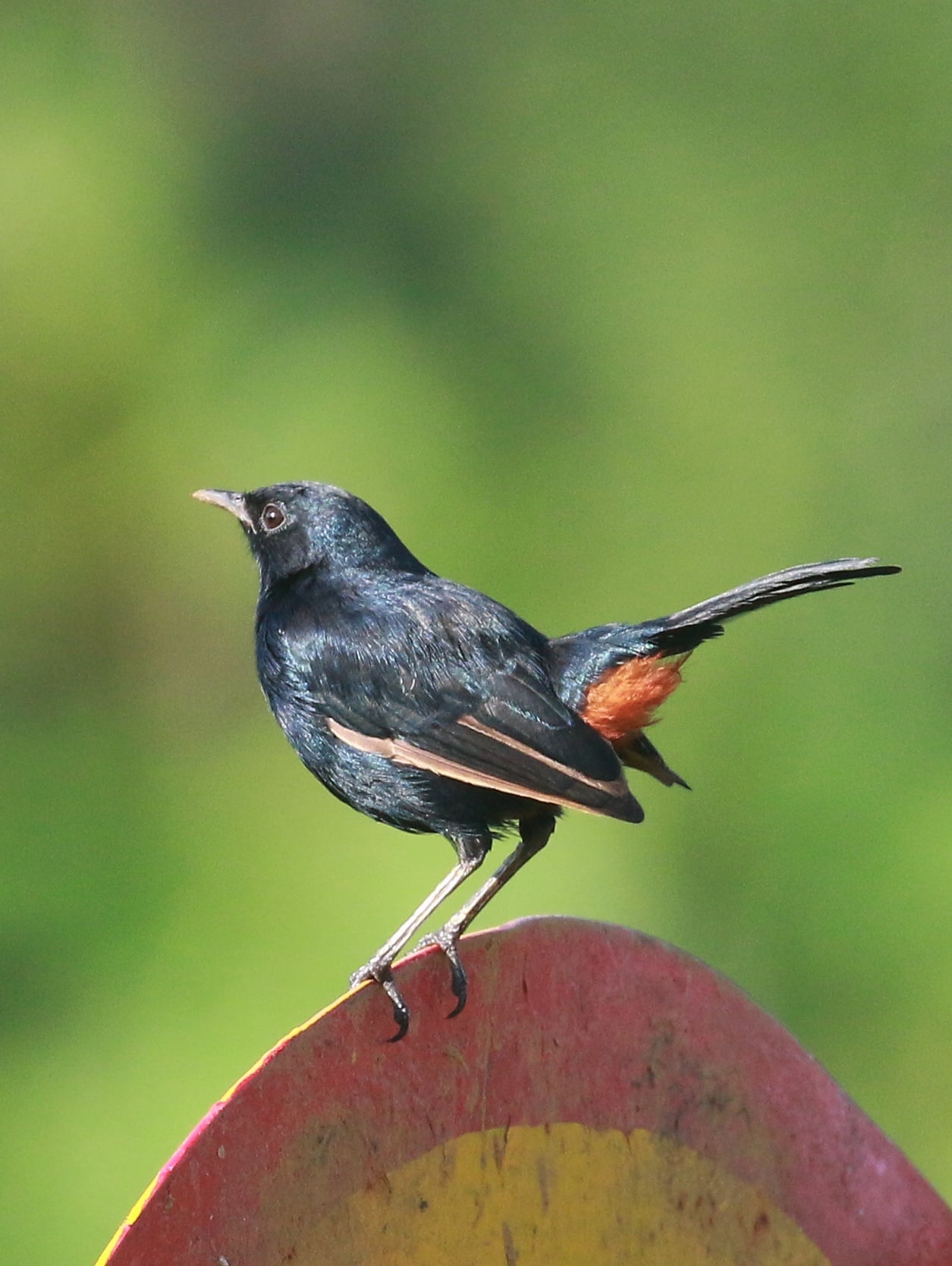 The Indian robin (Copsychus fulicatus) is a species of passarine bird in the family Muscicapidae. It is widespread in the Indian subcontinent and ranges across Bangladesh, Bhutan, India, Nepal, Pakistan and Sri Lanka. The males of the northern subspecies have brown backs whose extent gradually reduces southwards, with the males of the southern subspecies having all-black backs. They are commonly found in open scrub areas and often seen running along the ground or perching on low thorny shrubs and rocks. The long tail is usually held up and the chestnut undertail coverts and dark body make them easily distinguishable from pied bushchats and Oriental magpie-robins.