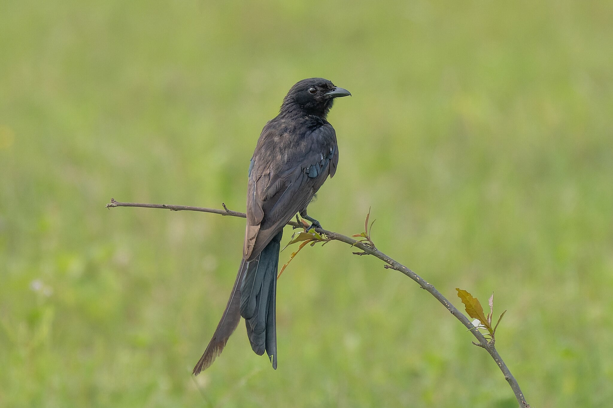 The black drongo (Dicrurus macrocercus) is a small Asian passerine bird of the drongo family Dicruridae. It is a common resident breeder in much of tropical southern Asia from southwest Iran through Pakistan, India, Bangladesh and Sri Lanka east to southern China and Indonesia and accidental visitor of Japan. It is an all black bird with a distinctive forked tail and measures 28 cm (11 in) in length. It feeds on insects, and is common in open agricultural areas and light forest throughout its range, perching conspicuously on a bare perch or along power or telephone lines.