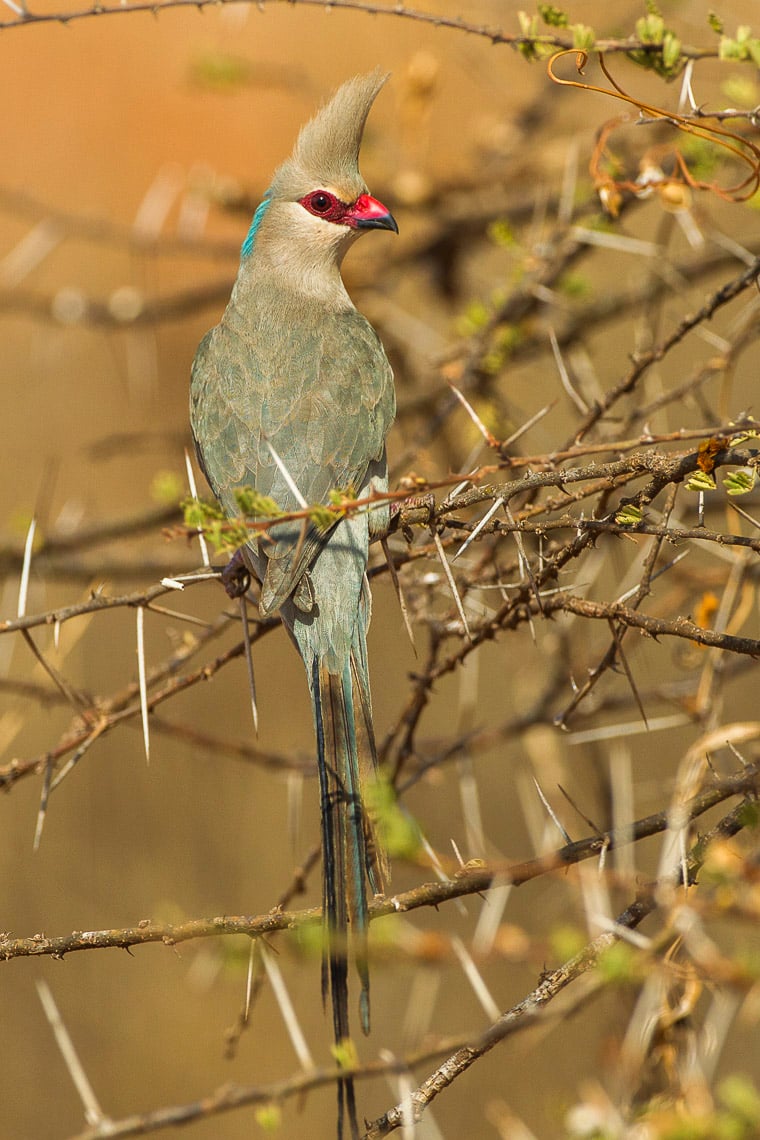 The blue-naped mousebird is a fairly small to medium-sized bird, measuring 33–38 cm (13–15 in) in length including the elongated tail of 20–28 cm (7.9–11.0 in), weighing 34–65 g (1.2–2.3 oz). Adults have an ash grey plumage which is darker at top and lighter at bottom. Has a bright turquoise-blue patch on nape and hindneck, long crest, slender and steeply graduated tail, females shorter than males. Both sexes are brown-tinged ash-grey above, greyish-buff below; bare skin on lores and around eyes crimson-red; most of upper mandible crimson-red, rest of bill black; feet purplish red. Juveniles lack the blue on nape, and have pink facial skin and greenish bills, as well as shorter crest.