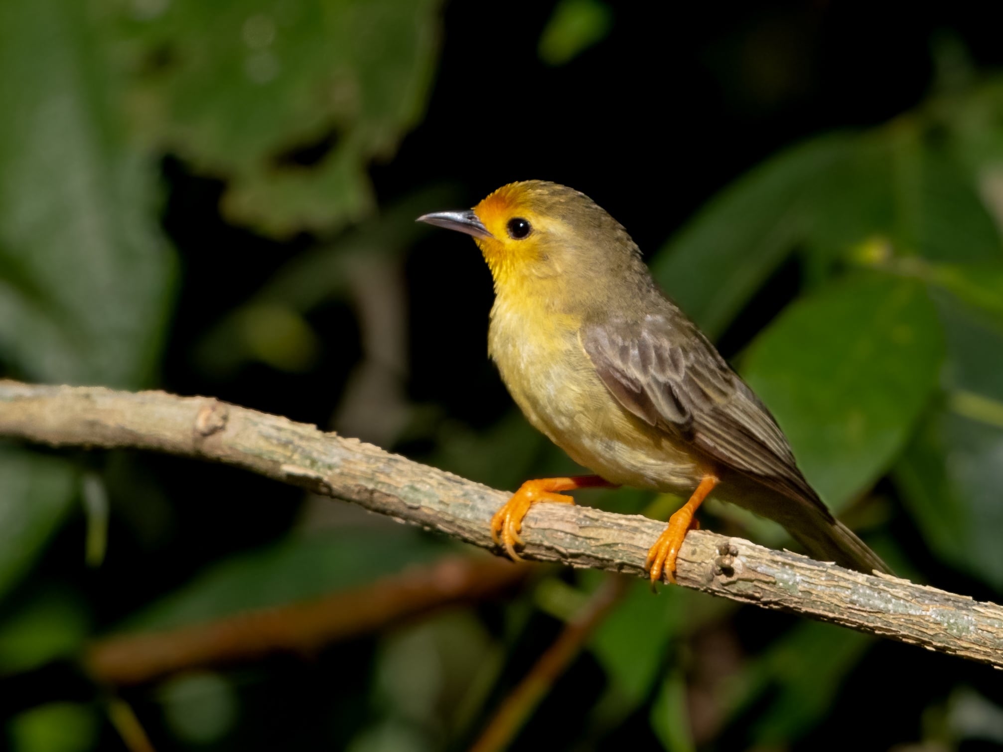 The orange-fronted plushcrown is 11 to 12 cm (4.3 to 4.7 in) long and weighs 10 to 12 g (0.35 to 0.42 oz). The sexes have the same plumage. Adults have an orange forehead ("front") and yellow lores, eyering, and supercilium; the last becomes greenish yellow behind the eye. They have a faint greenish olive line through the eye and greenish olive ear coverts. Their crown, back, rump, and tail are greenish olive, with the rump being somewhat paler. The "plush" of the crown is usually not apparent in the field. Their wings are dark olive fuscous with pale yellow edges on the coverts and flight feathers. Their throat is yellow and the rest of their underparts are dull yellowish green that is slightly paler on the belly. Their iris is brown to dark brown to gray, their maxilla black, their mandible black to gray, and their legs and feet bright yellow-orange to yellow. Juveniles have little or no orange and yellow on their face. It is the only species of furnariid with yellow/greenish plumage and yellow legs, in which it resembles a tanager or warbler.