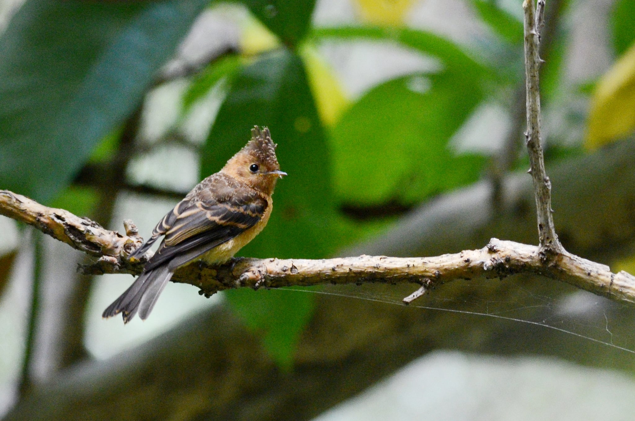 The northern tufted flycatcher is 12 to 13.5 cm (4.7 to 5.3 in) long and weighs about 8.5 g (0.30 oz). The sexes have the same plumage and all subspecies have an erect pointed crest. Adults of the nominate subspecies M. p. phaeocercus have a brown-tinged olive crown, a pale spot above the lores, and a thin buff-white eye-ring on an otherwise cinnamon face. Their upperparts are brownish with an olive tinge. Their wings are dusky with buff ends on the coverts that show as two wing bars. They have whitish or pale yellow edges on their tertials. Their tail is dusky. Their throat and breast are bright ochre to cinnamon and their belly ochre-yellow. They have a dark iris, a black maxilla, an orange-yellow mandible, and blackish legs and feet. Juveniles have a dark brown crown with cinnamon-buff edges on its feathers and those of their upperparts.
