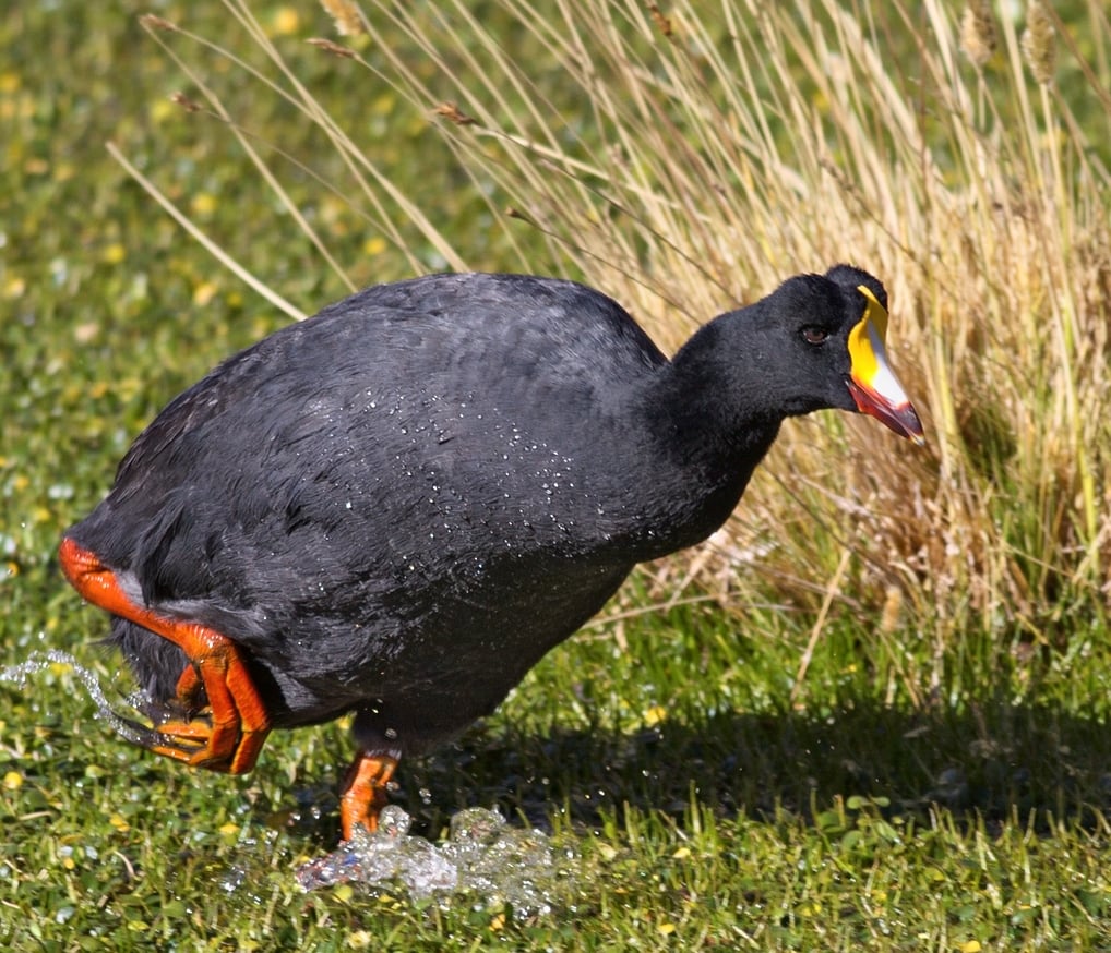 The giant coot is the second largest extant member of family Rallidae, after the takahē of New Zealand. Adults are 48 to 59 cm (19 to 23 in) long. They weigh about 2,000 to 2,500 g (4.4 to 5.5 lb) and are too heavy to fly, though immature birds are smaller and readily fly. The sexes are alike. Adults have a bulky body and a disproportionately small head. Their plumage is deep slaty gray that is blacker on the head and neck. Their undertail coverts have some white streaking. Their bill is deep red with some yellow at the base of the maxilla, their frontal shield is yellow, and unique among coots their legs and feet are deep red. Immature birds have dark gray underparts and a paler bill and legs than adults. Juveniles are dark dull gray with some white on the face and dusky legs.