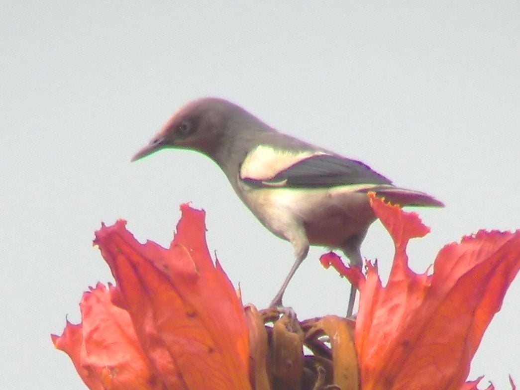 The white-shouldered starling has blue eyes, a grey bill, and a white patch on the shoulder. The adult male has a light brown head and breast and a white belly while an adult female is darker brown on the back and belly. This bird is usually found in large flocks.