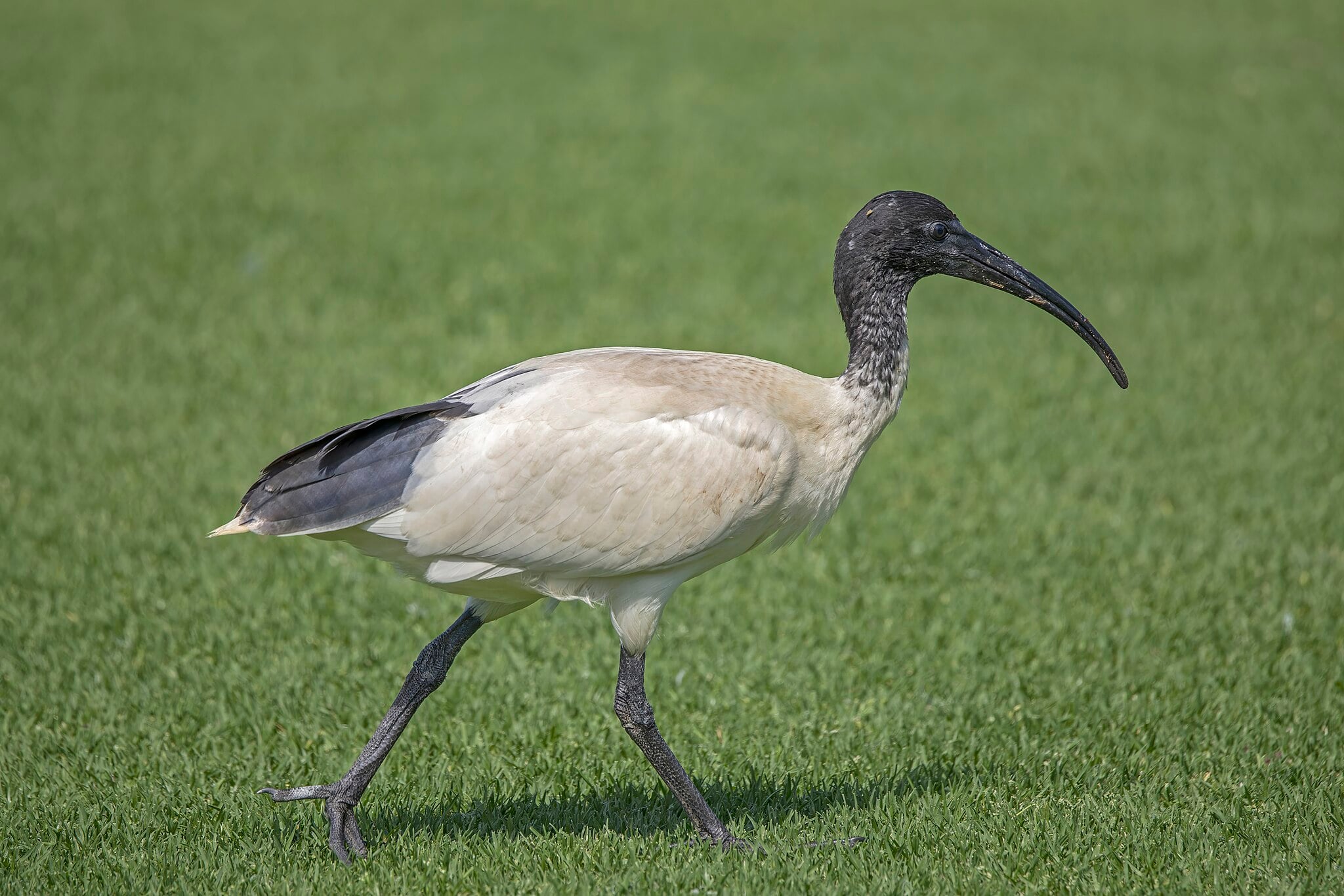 The Australian white ibis (Threskiornis molucca) is a wading bird of the family Threskiornithidae. It is widespread across much of Australia. It has a predominantly white plumage with a bare, black head, long downcurved bill, and black legs. While it is closely related to the African sacred ibis, the Australian white ibis is a native Australian bird. Contrary to urban myth, it is not a feral species introduced to Australia by people, and it does not come from Egypt.