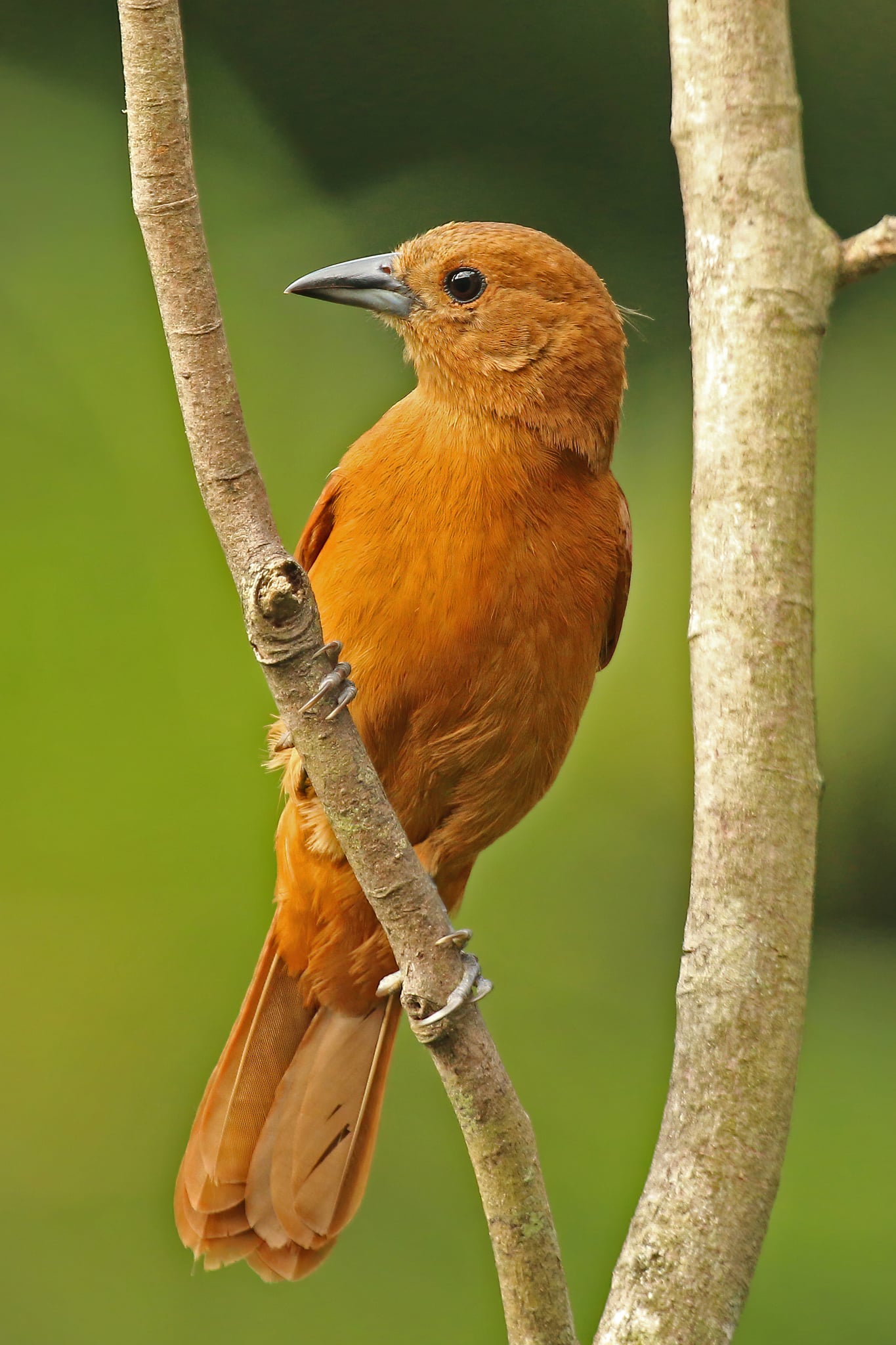 The adult white-lined tanager is 18.5 cm (7.3 in) long and weighs 33 g (1.2 oz). It has a long tail and a mostly black stout pointed bill. The adult male is glossy black, apart from white underwing coverts and a small white patch on the upperwing. These white areas are conspicuous in flight but otherwise rarely visible. Females and immatures are entirely rufous in plumage, somewhat paler below.